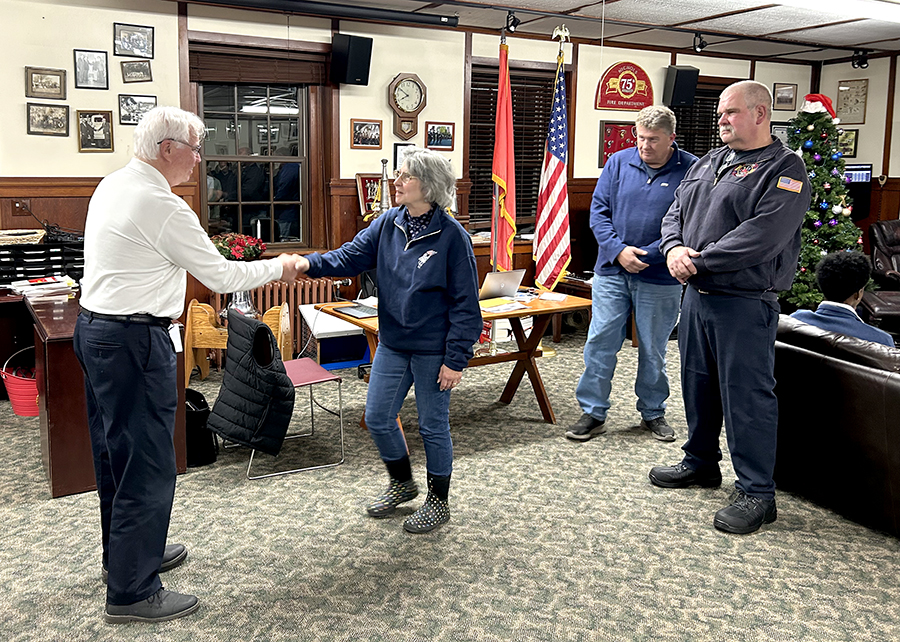 Commissioner Patrick Freyer congratulates Tax Collector Kathy Gillis after her swearing in as an affiliate member at the December NFD monthly meeting, while Chief Mumbach and FF Dave Gillis look on.